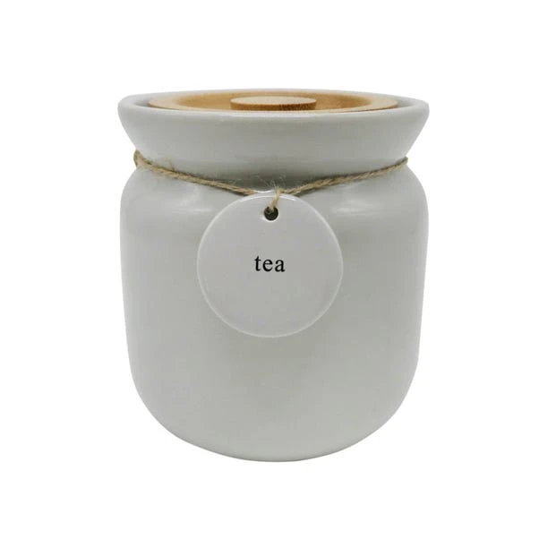 Decorated with a hang tag featuring the text ‘tea’, this kitchen canister comes in a light grey colourway with a shiny glaze finish and is complete with an air tight, wooden lid.