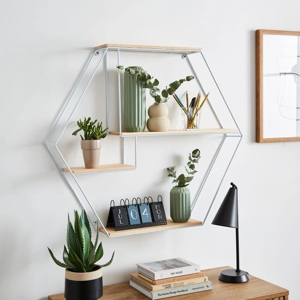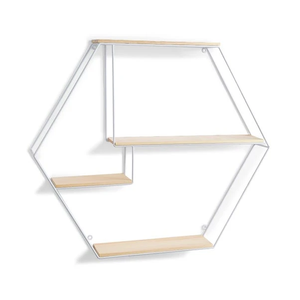 A sleek and versatile addition to any modern living space, this Hexagon wall shelf unit is crafted with a compact design, featuring natural wood panels and a striking geometrical hexagonal shape, seamlessly blending functionality with contemporary aesthetics. With three spacious storage shelves, organising your essentials has never been easier.