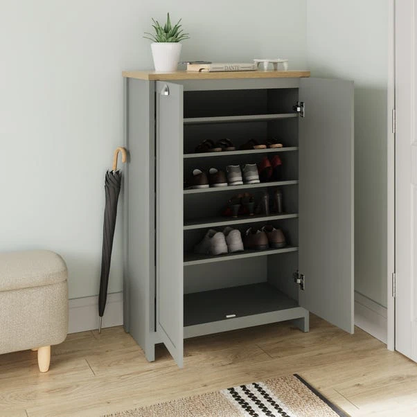 Inspired by countryside cottages, this Lancaster Shoe Cabinet is complete with six adjustable shelves and is perfect for neatly storing away footwear. Available in either a cream or grey colourway, and featuring a contrasting oak effect top, this product is as stylish as it is practical.